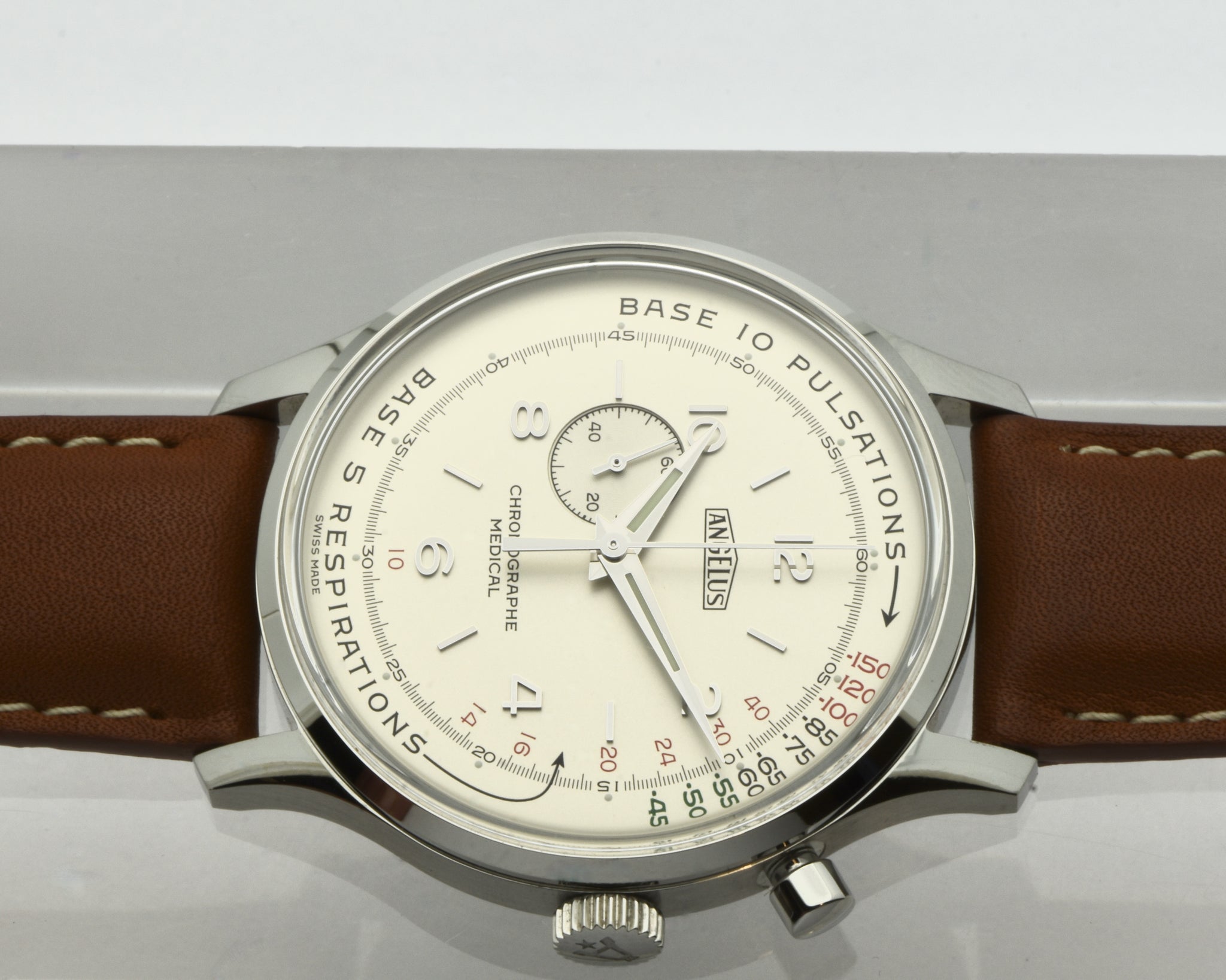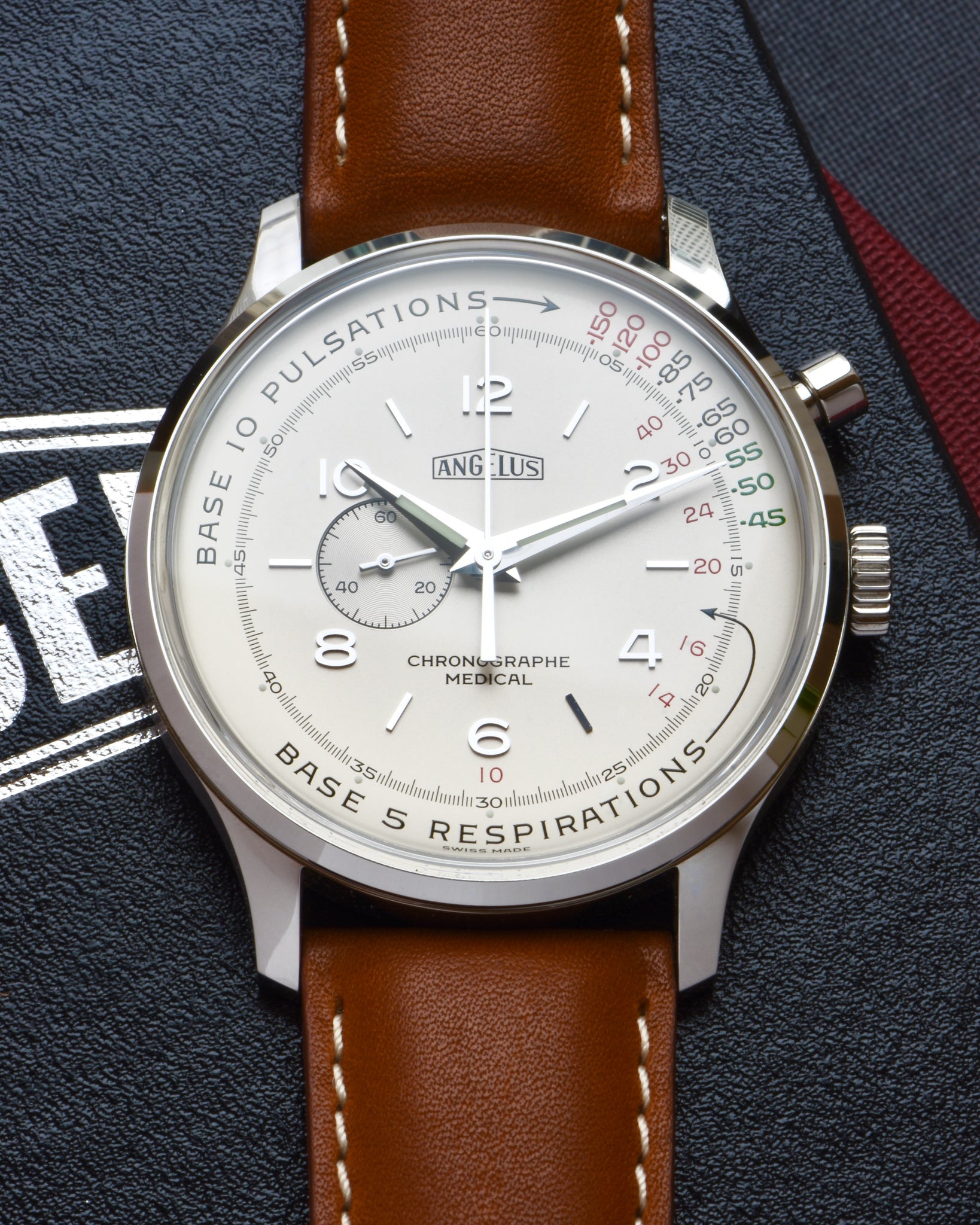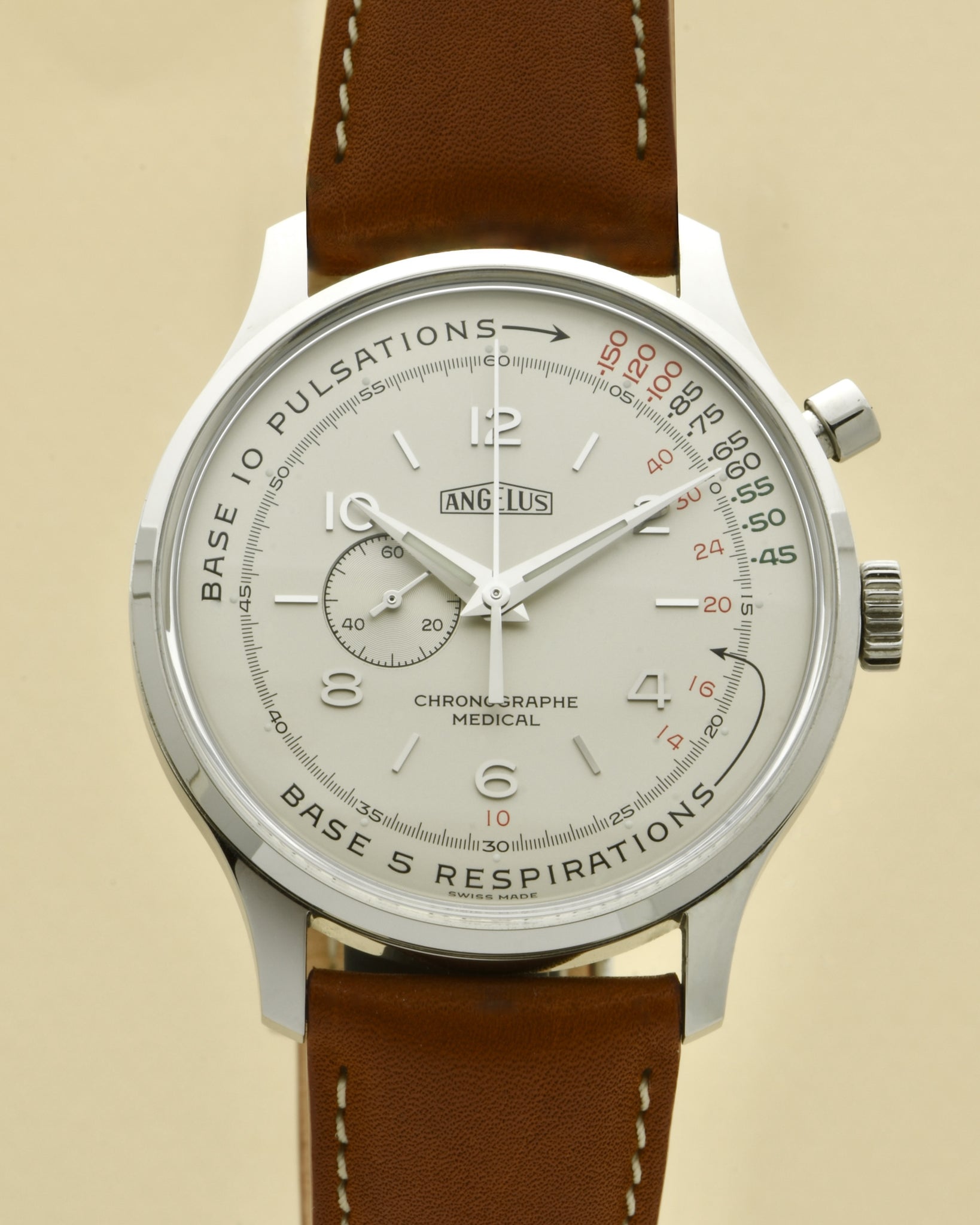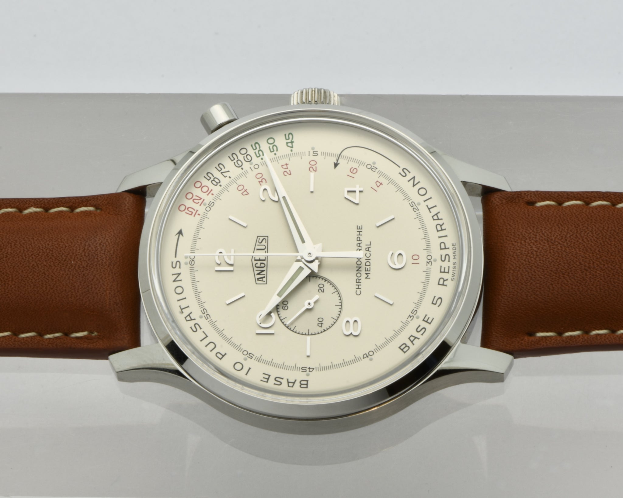 Dial: Silvered dial with pulsometer scale based on 10 pulsations and asthmometer scale based on 5 respirations. Applied, rhodium-plated Arabic numerals. Small seconds at 9 o’clock.