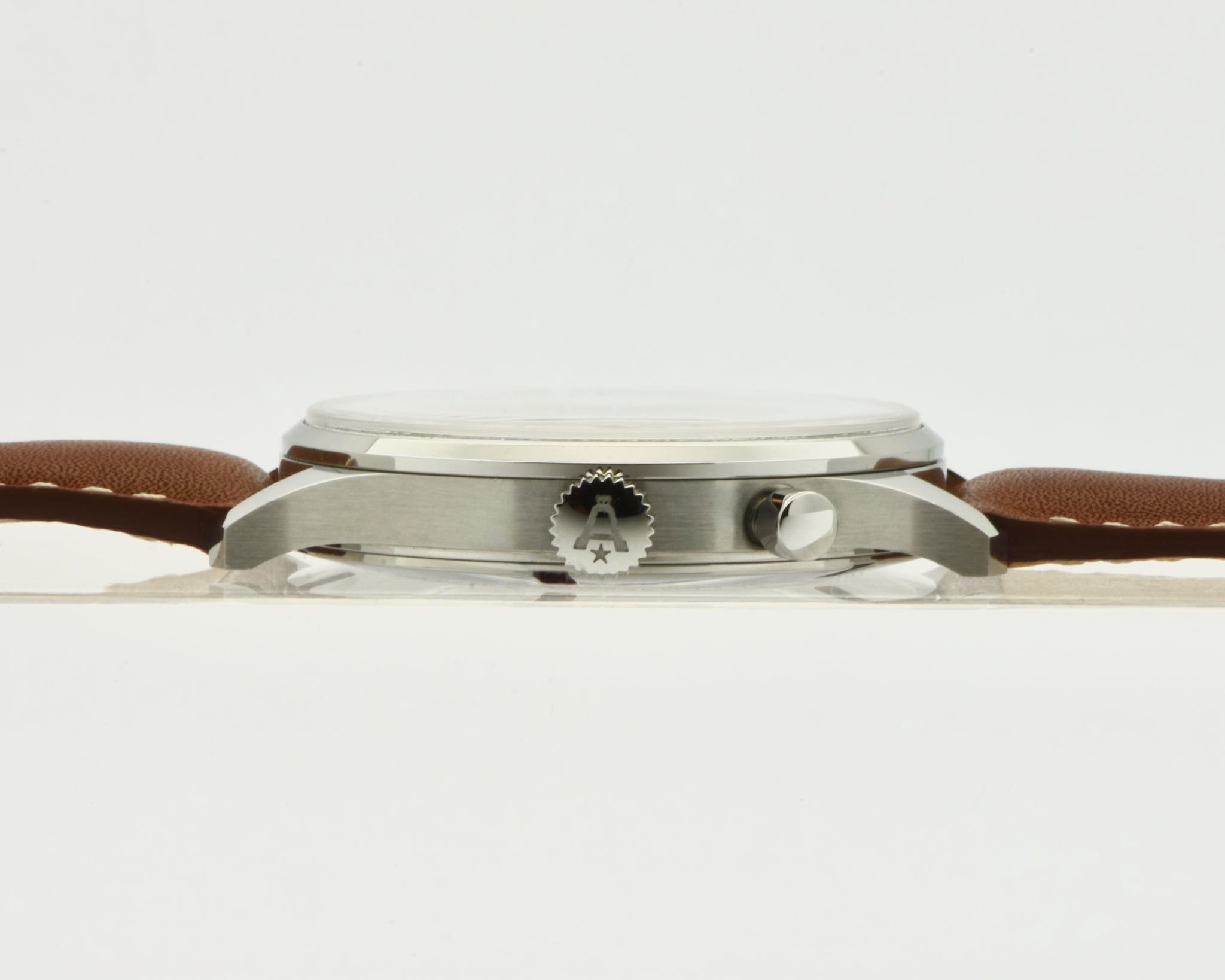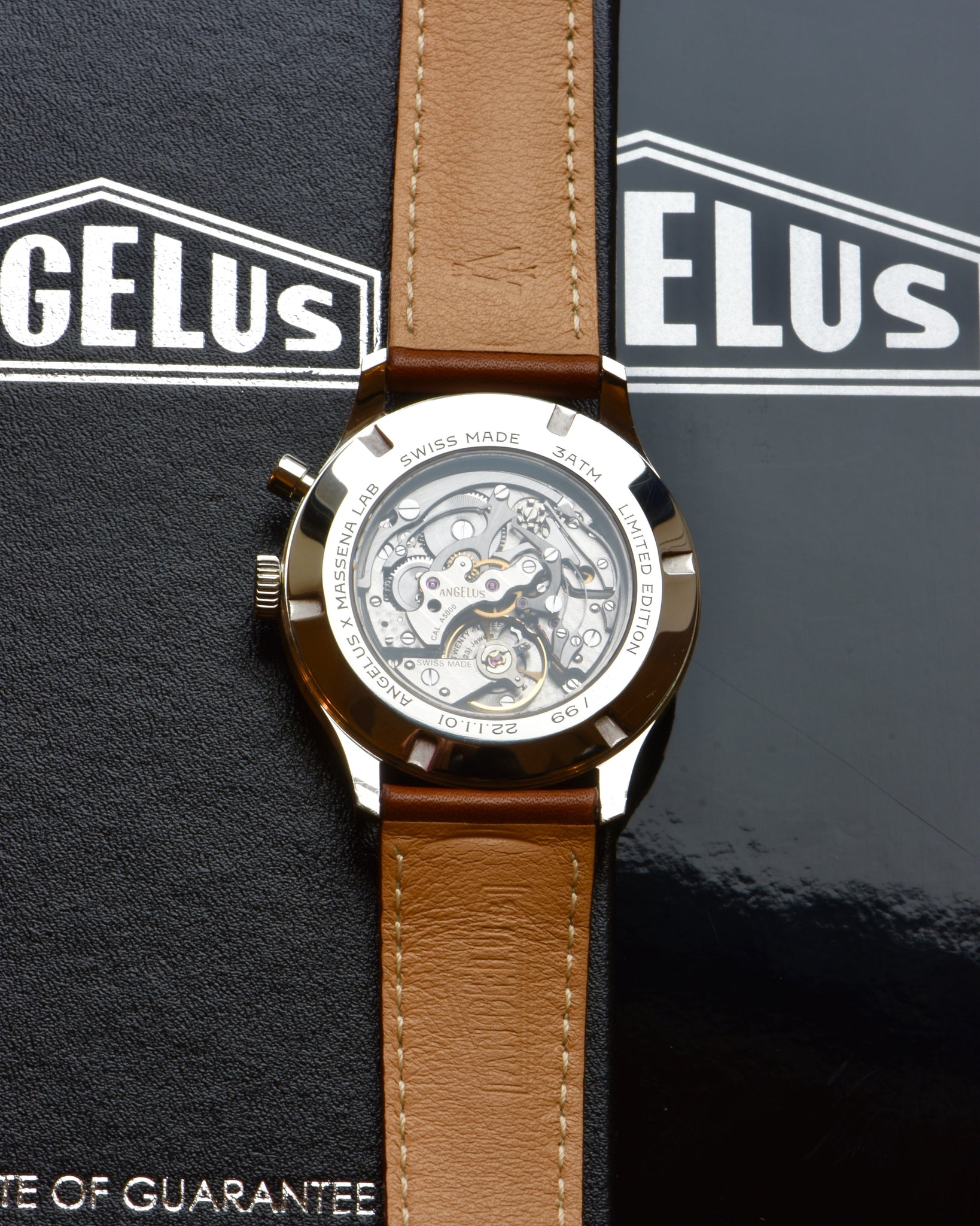 Movement: Manual winding Angelus caliber A5000. Based on the original monopusher chronograph movement developed by THA Ébauche. 21,600 mph (3 Hz). 42 hours of power reserve. 23 jewels.