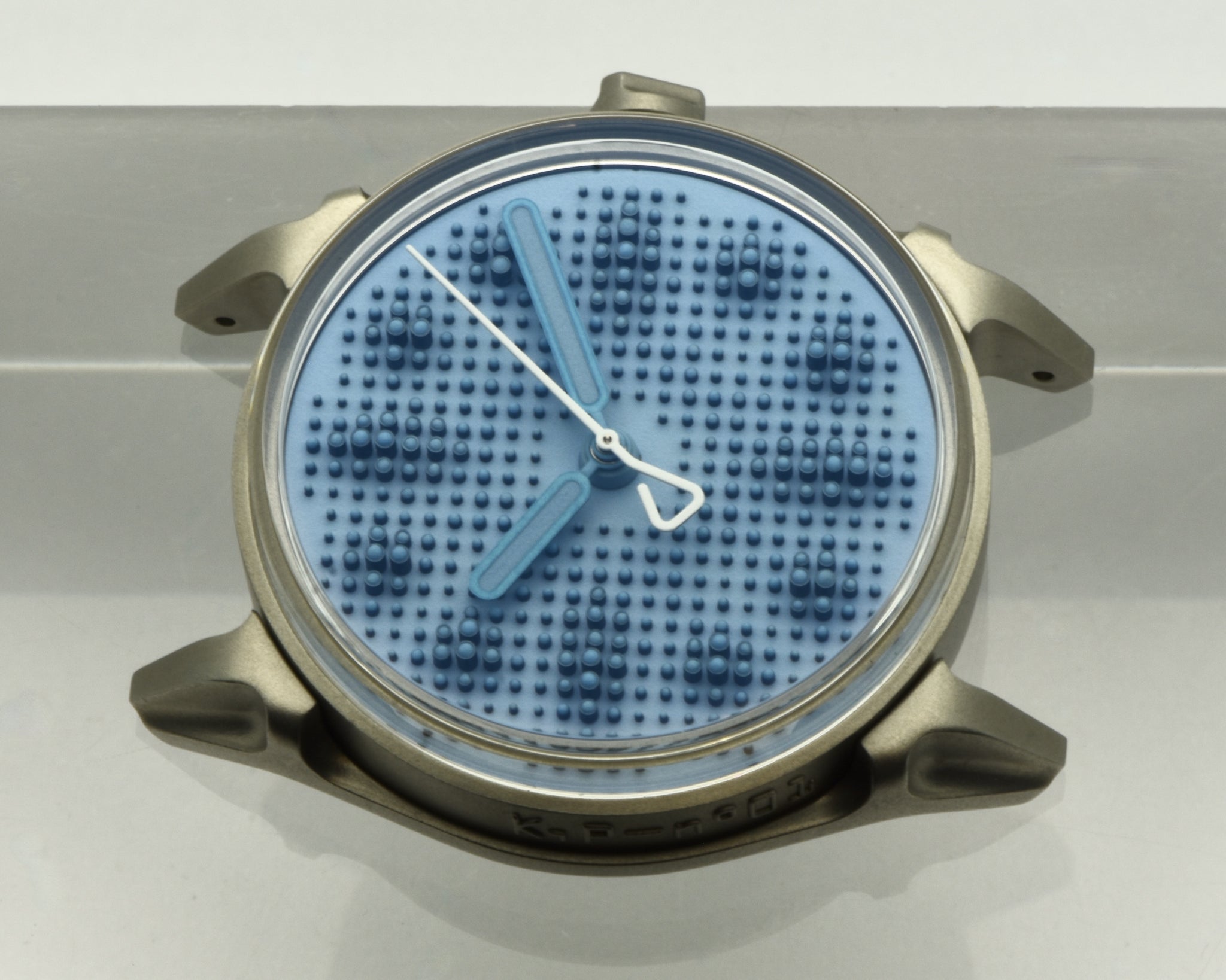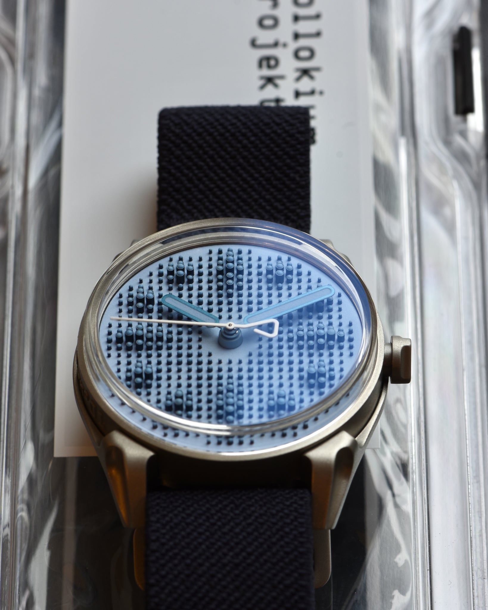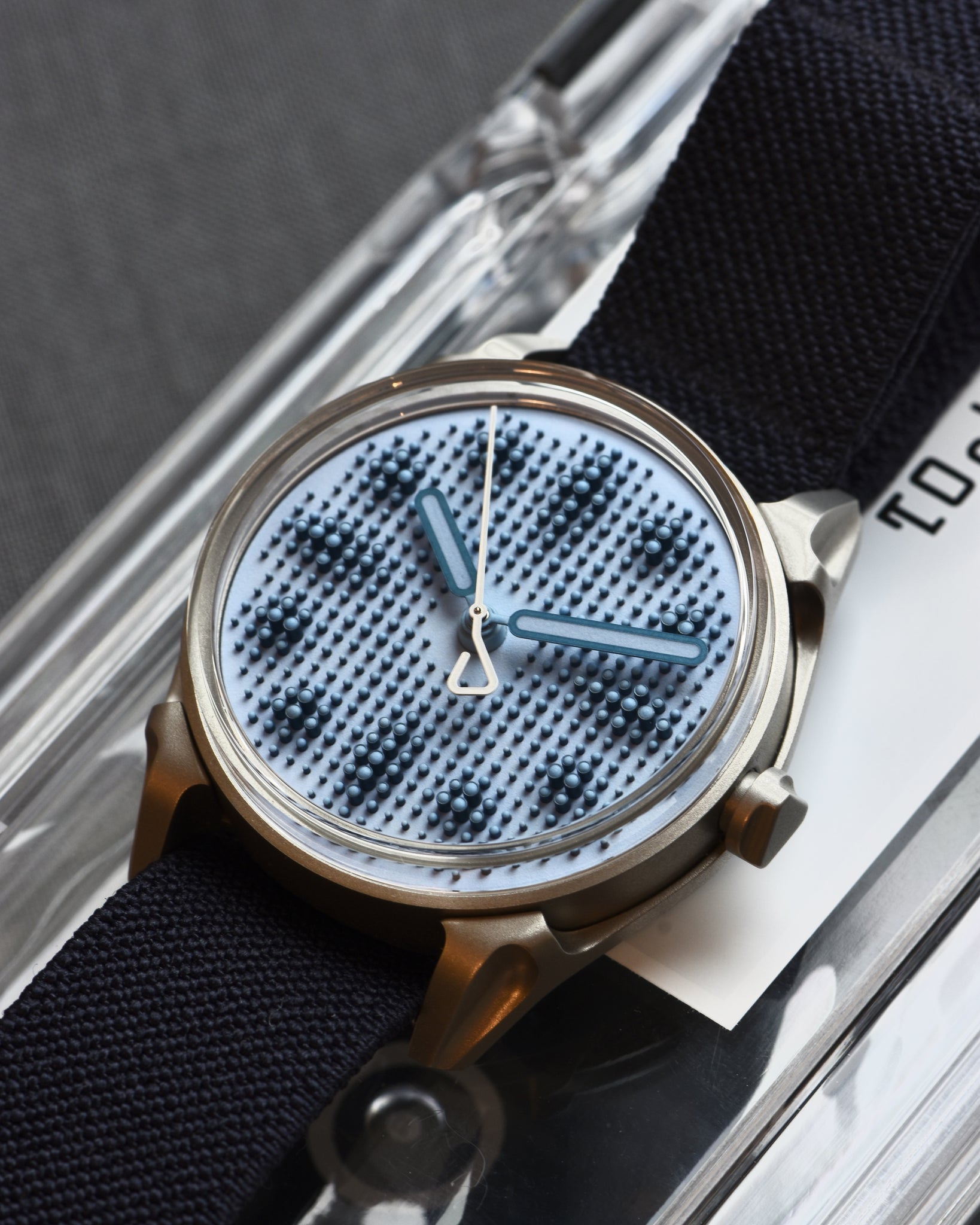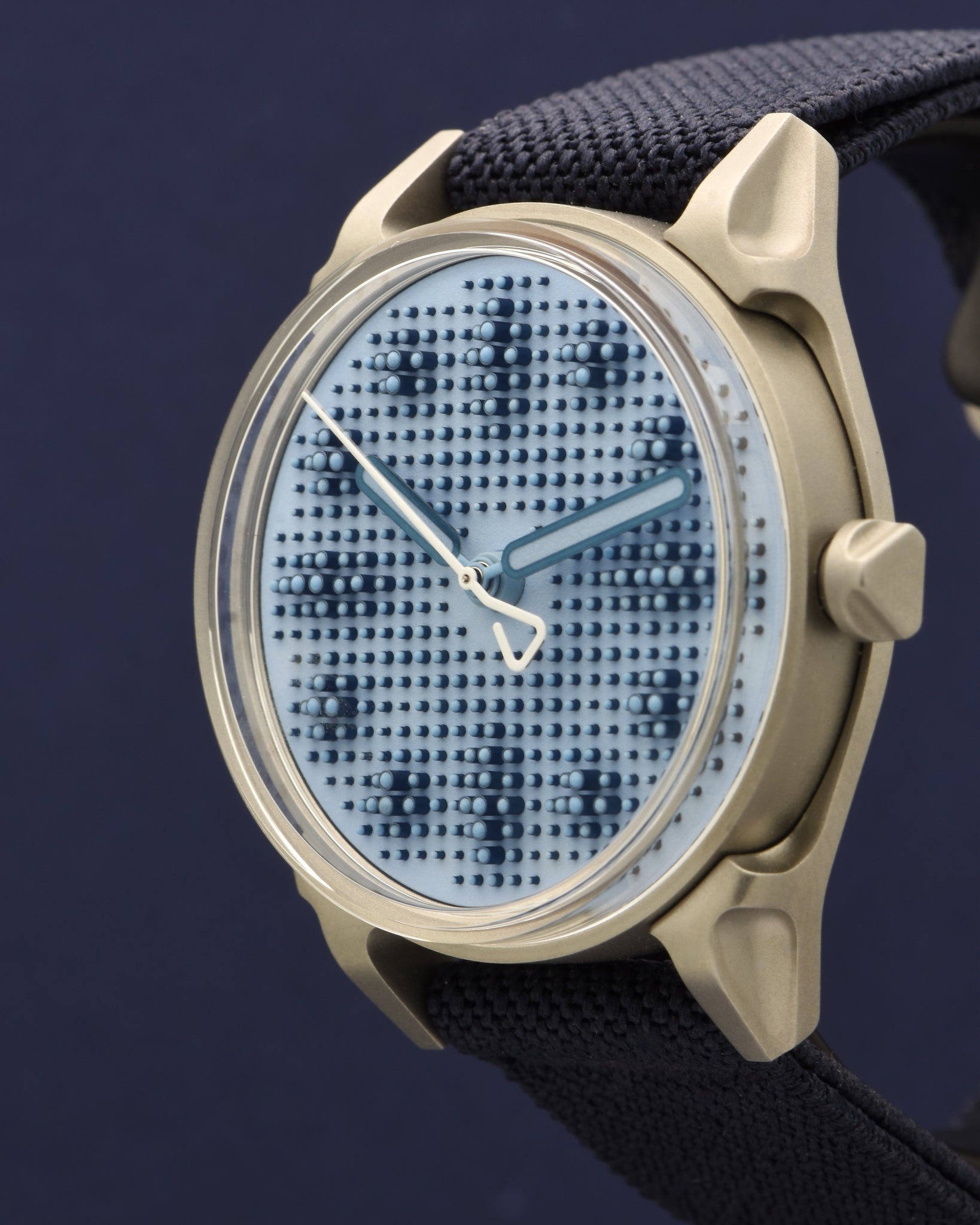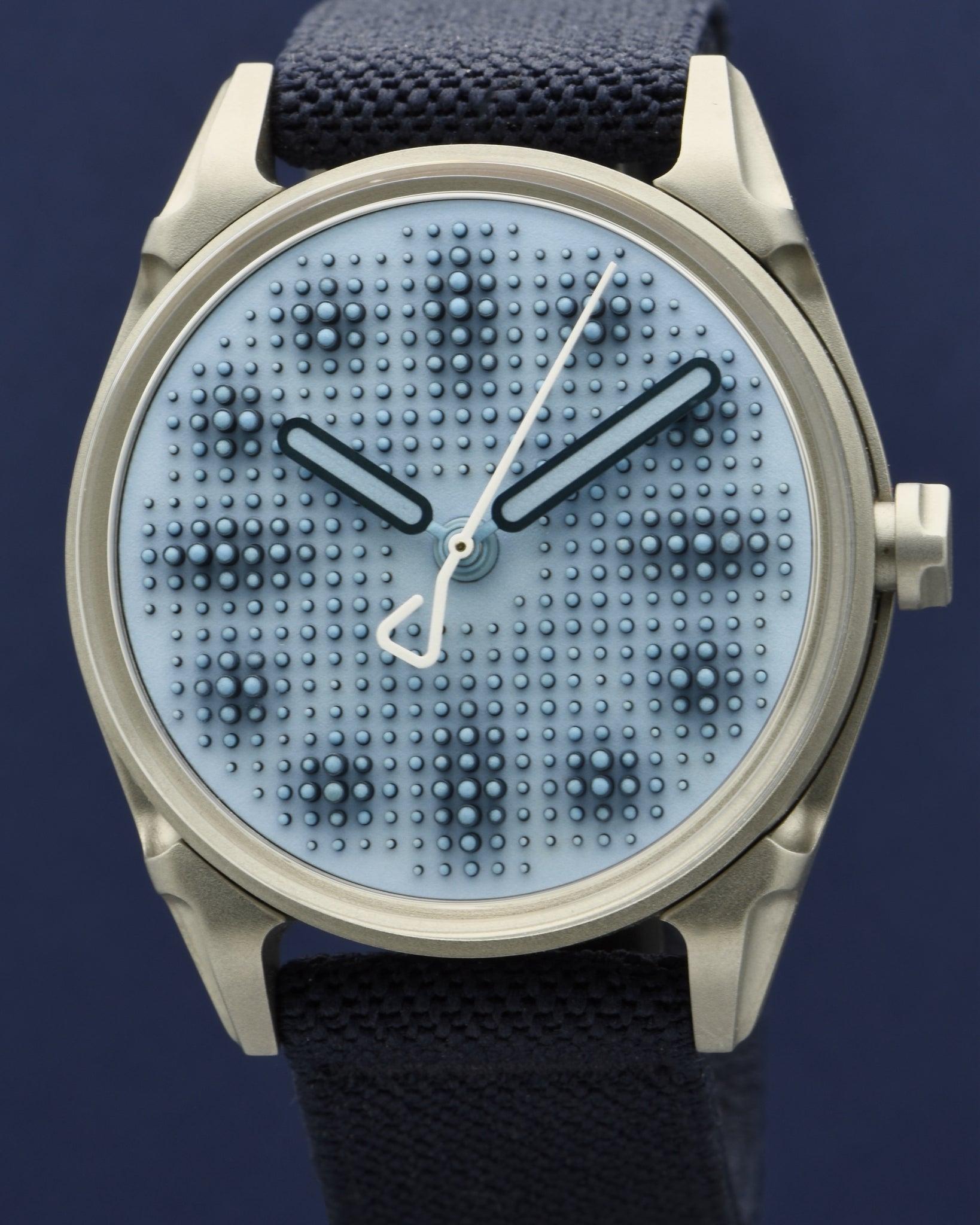 Dial: Textured grey-blue dial with blue Super-LumiNova. 468 applied cylindrical markers in blue PVD with blue emission Super LumiNova on each tip. Blue PVD hour and minute hands with blue Super-LumiNova center. White seconds hand.
