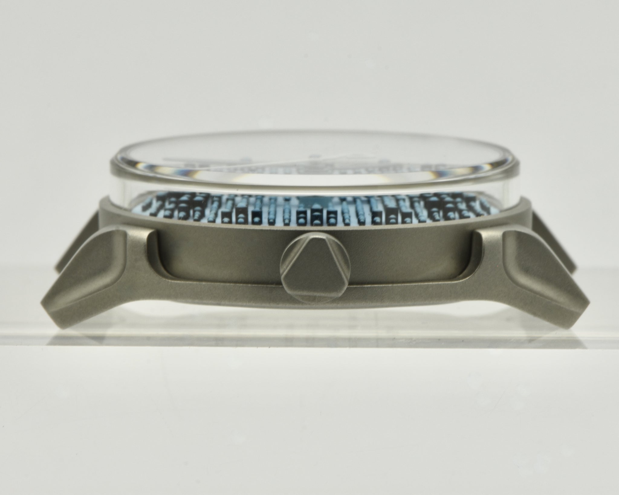 Case: Two-part die-cast 316L stainless steel with a cylindrical sapphire box crystal. Height without crystal: 7mm; with crystal: 11.6mm. Solid case back. Water-resistant to 50m.