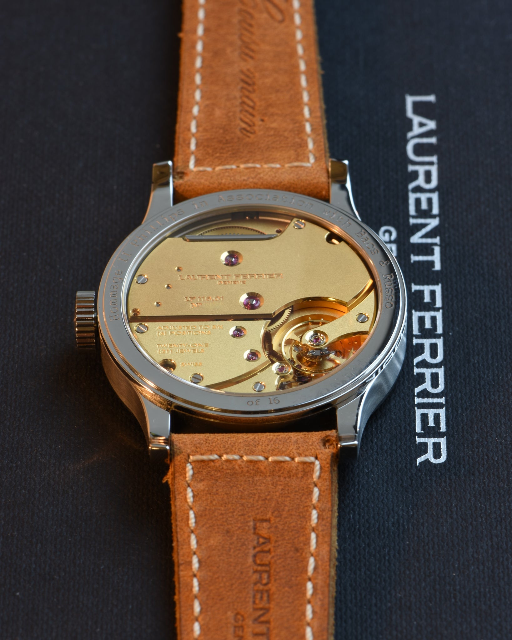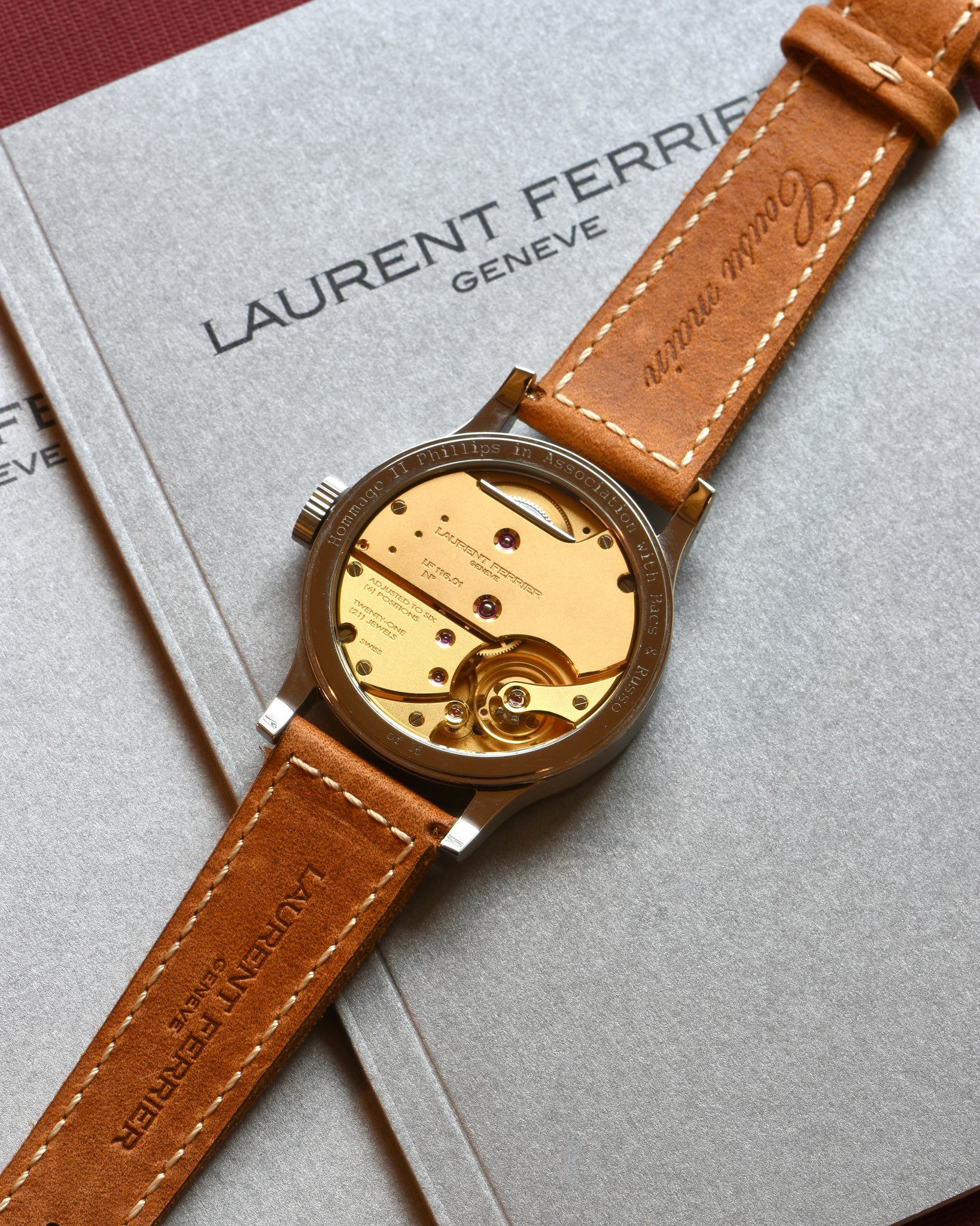 Movement: Laurent Ferrier caliber LF116.01 hand-wound movement with frosted finish and 80 hours of power reserve. 21 jewels. 21,6000 vph (3Hz). 150 components.