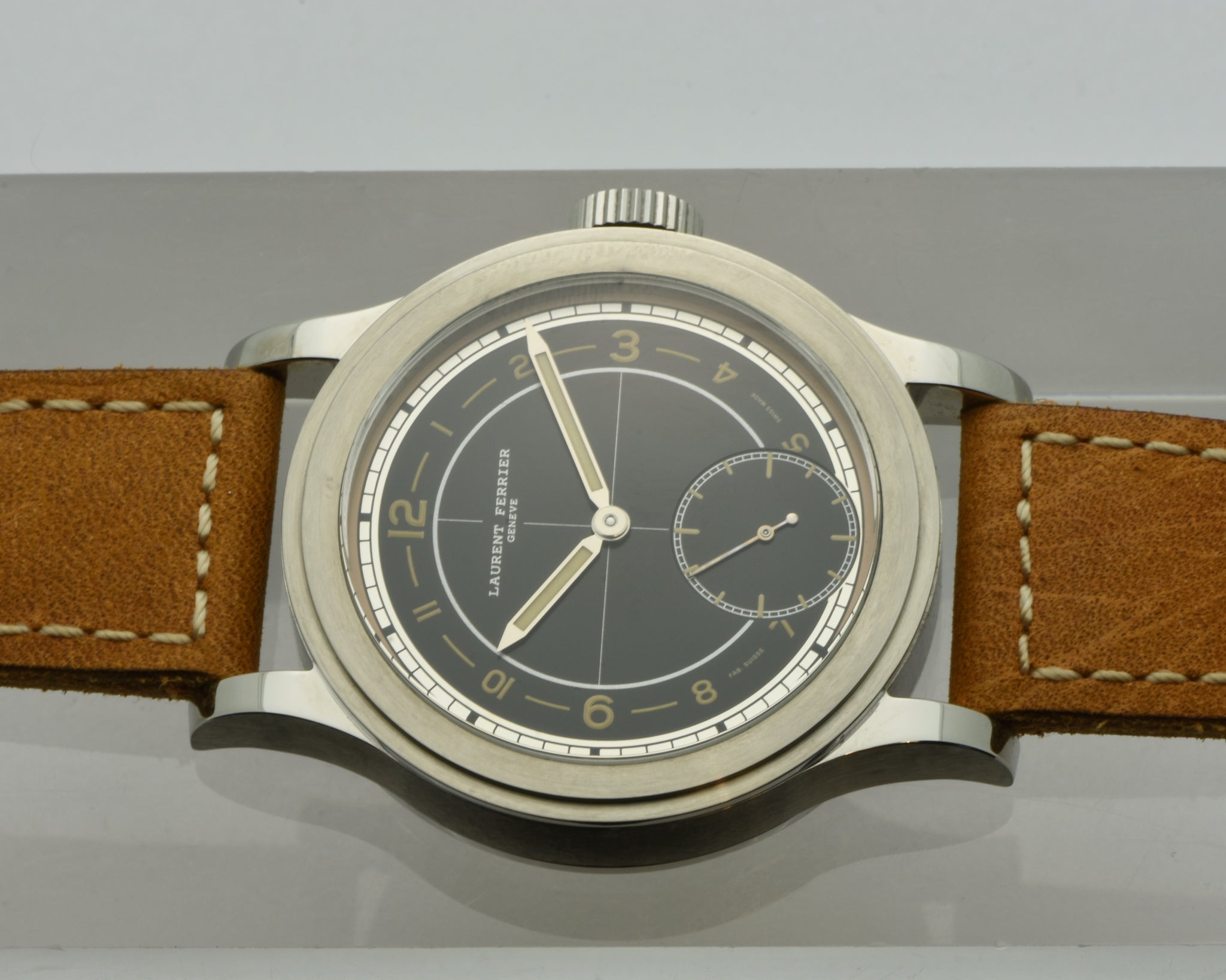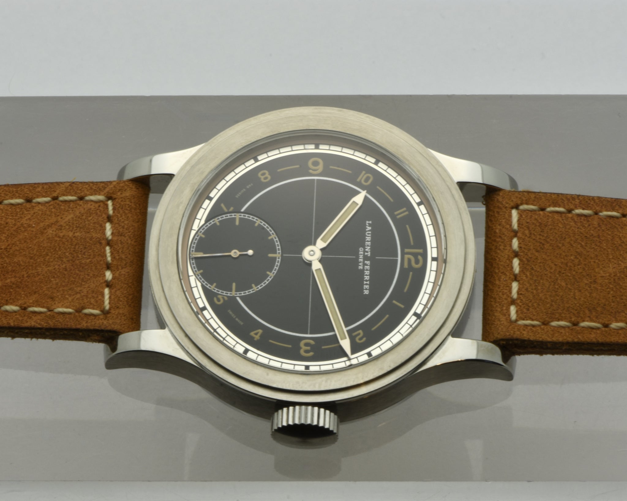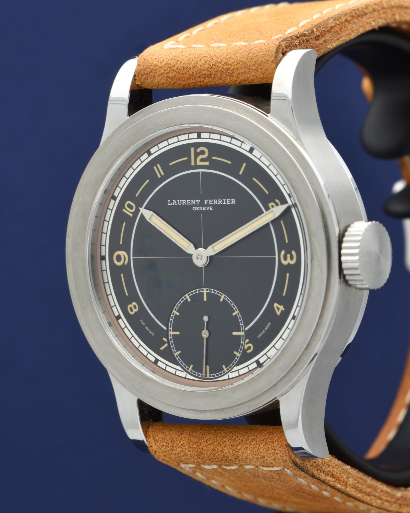 Dial: Black, military inspired bezel with crosshair, luminous Arabic numerals of the hours, luminous hands, small seconds at 9 o’clock, and outer minute railroad track. Custom Laurent Ferrier signature designed specifically for this vintage-inspired Philips collaboration.