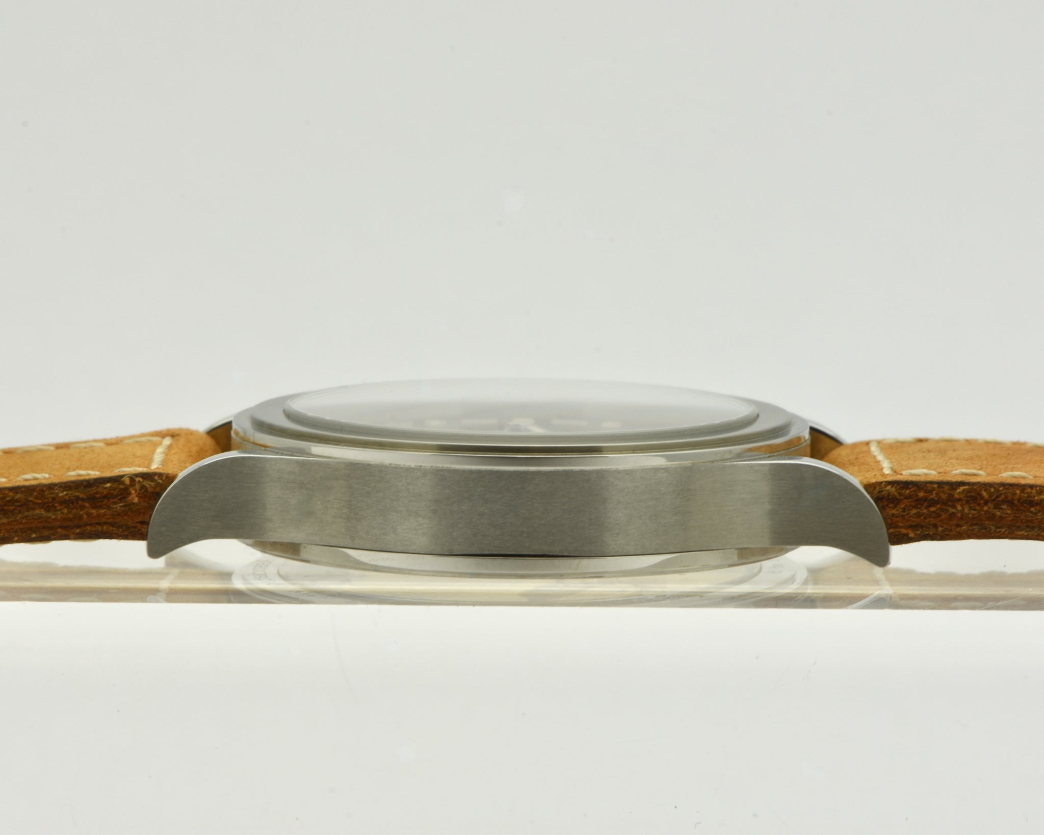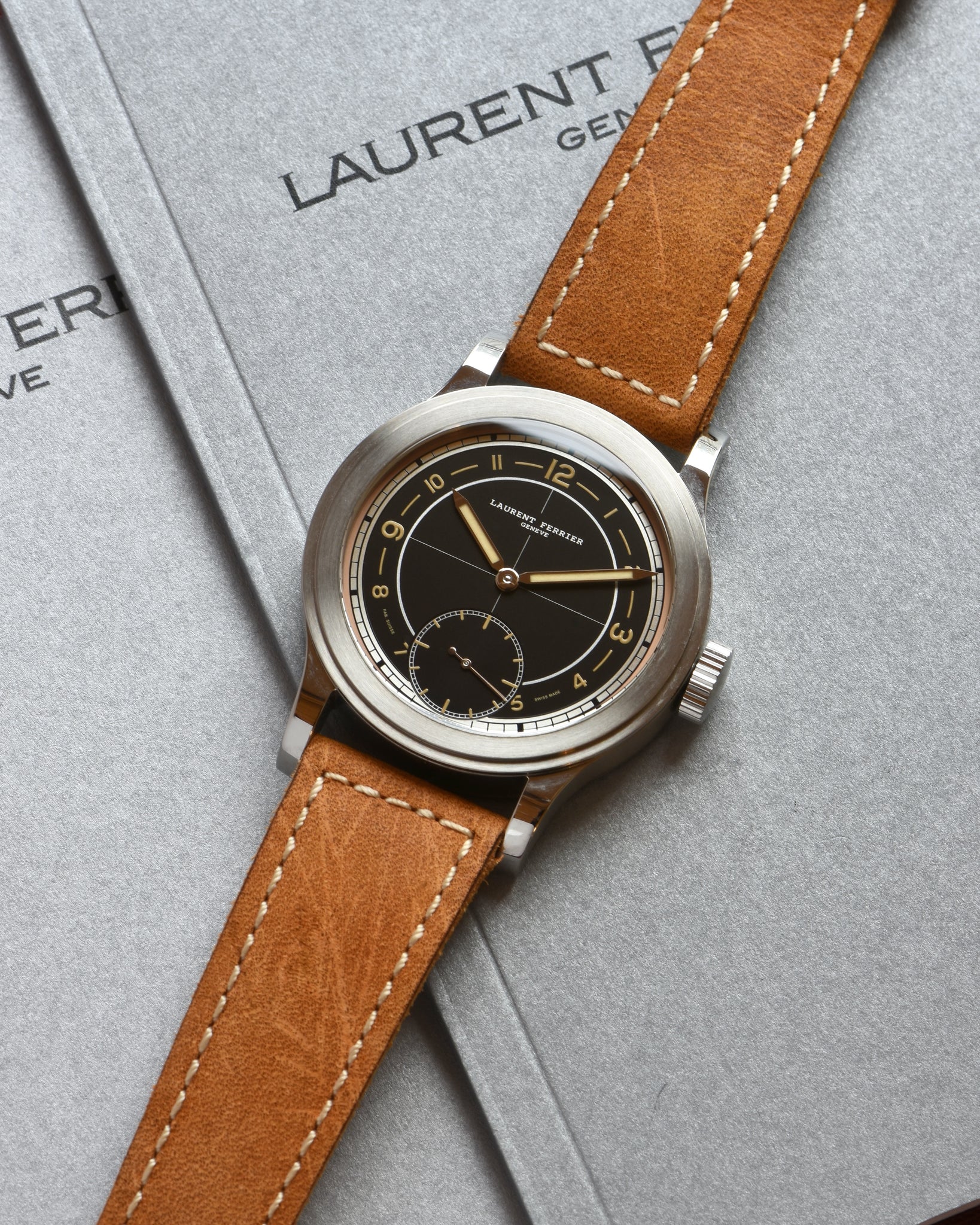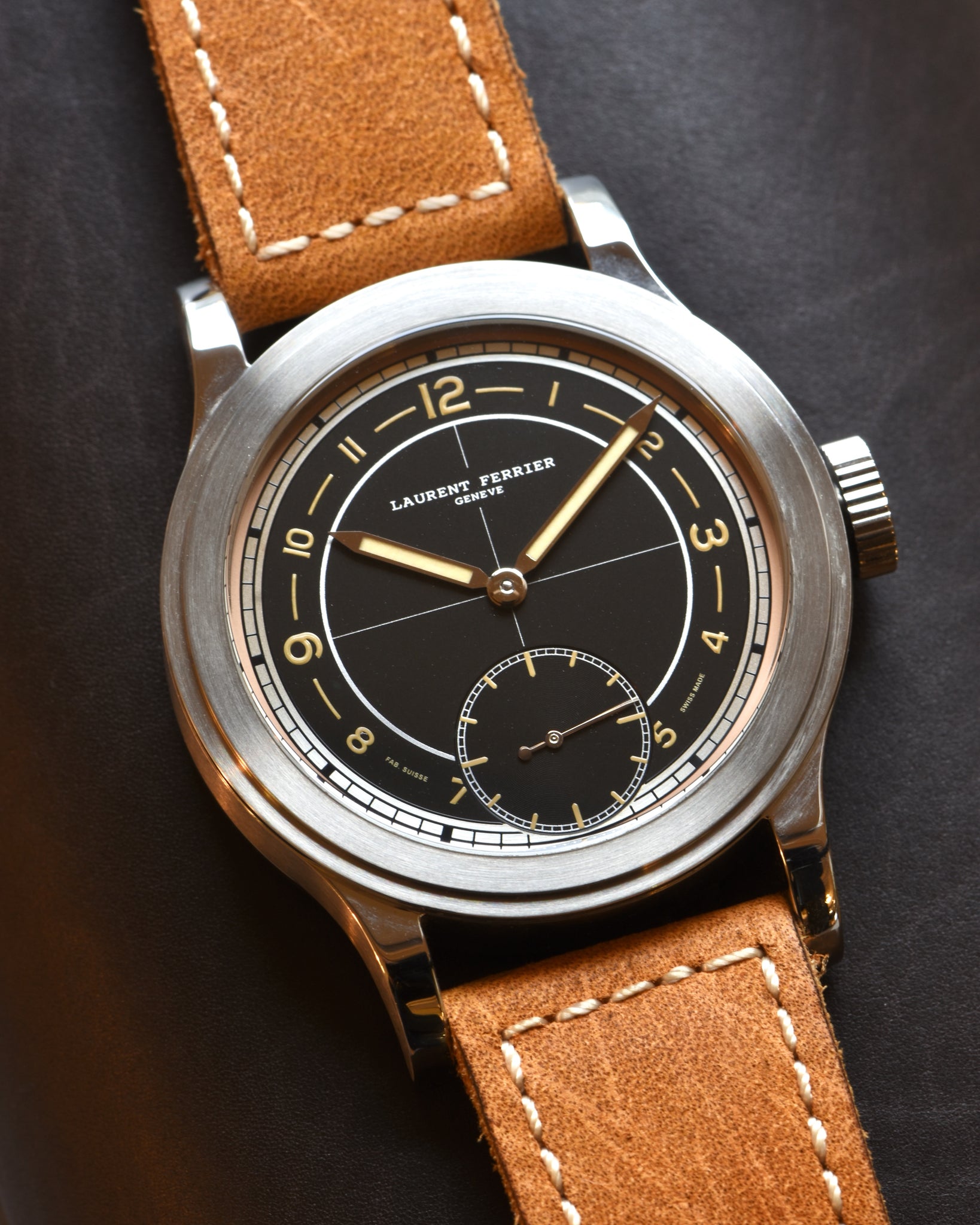 Dial: Black, military inspired bezel with crosshair, luminous Arabic numerals of the hours, luminous hands, small seconds at 9 o’clock, and outer minute railroad track. Custom Laurent Ferrier signature designed specifically for this vintage-inspired Philips collaboration.
