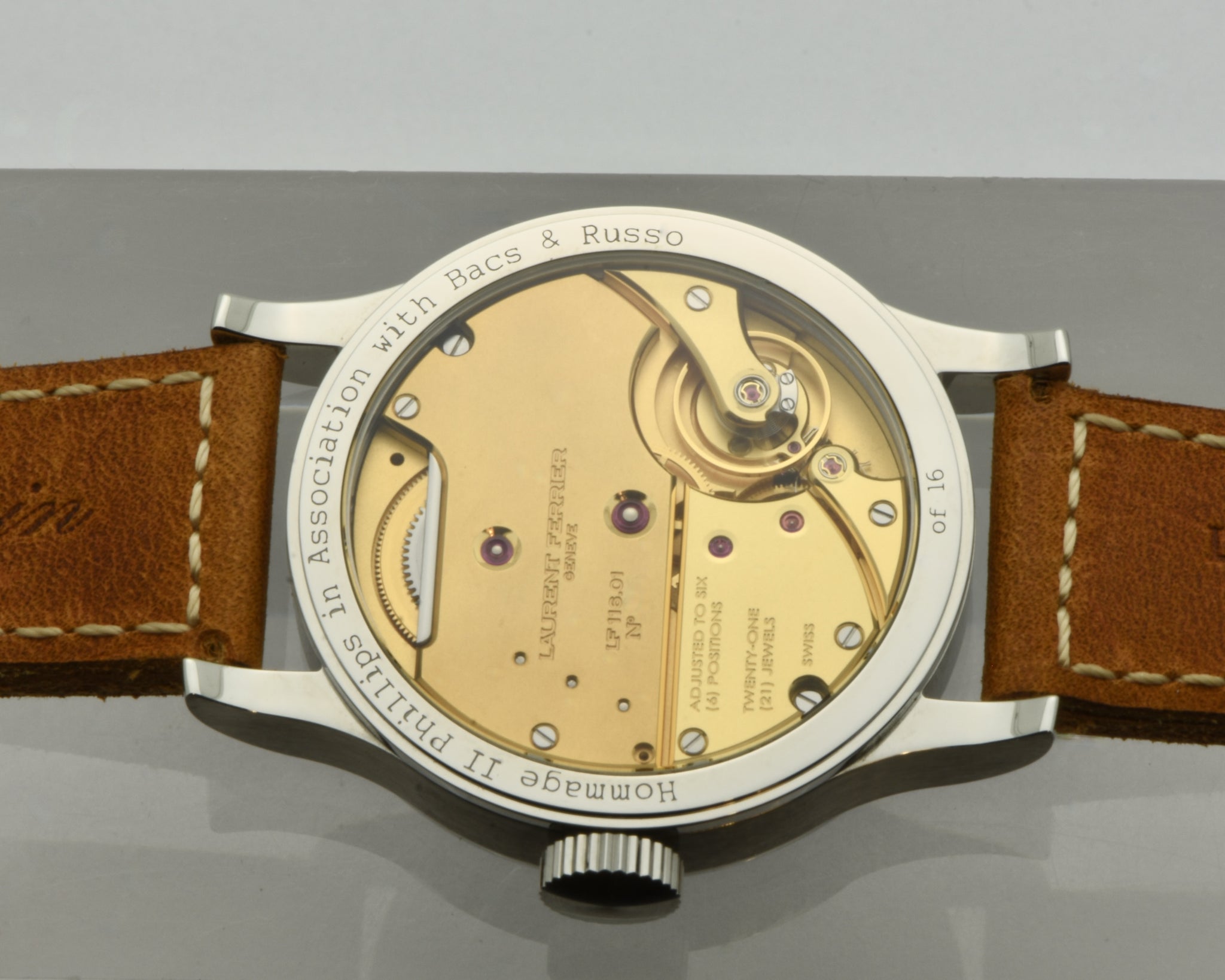 The present watch is Laurent Ferrier’s second collaboration with Phillip in Association with Bacs & Russo. Limited to only 32 pieces total: 16 pieces in white and blush with blued steel hands, and 16 pieces with a black dial and luminous hands, like the present example.